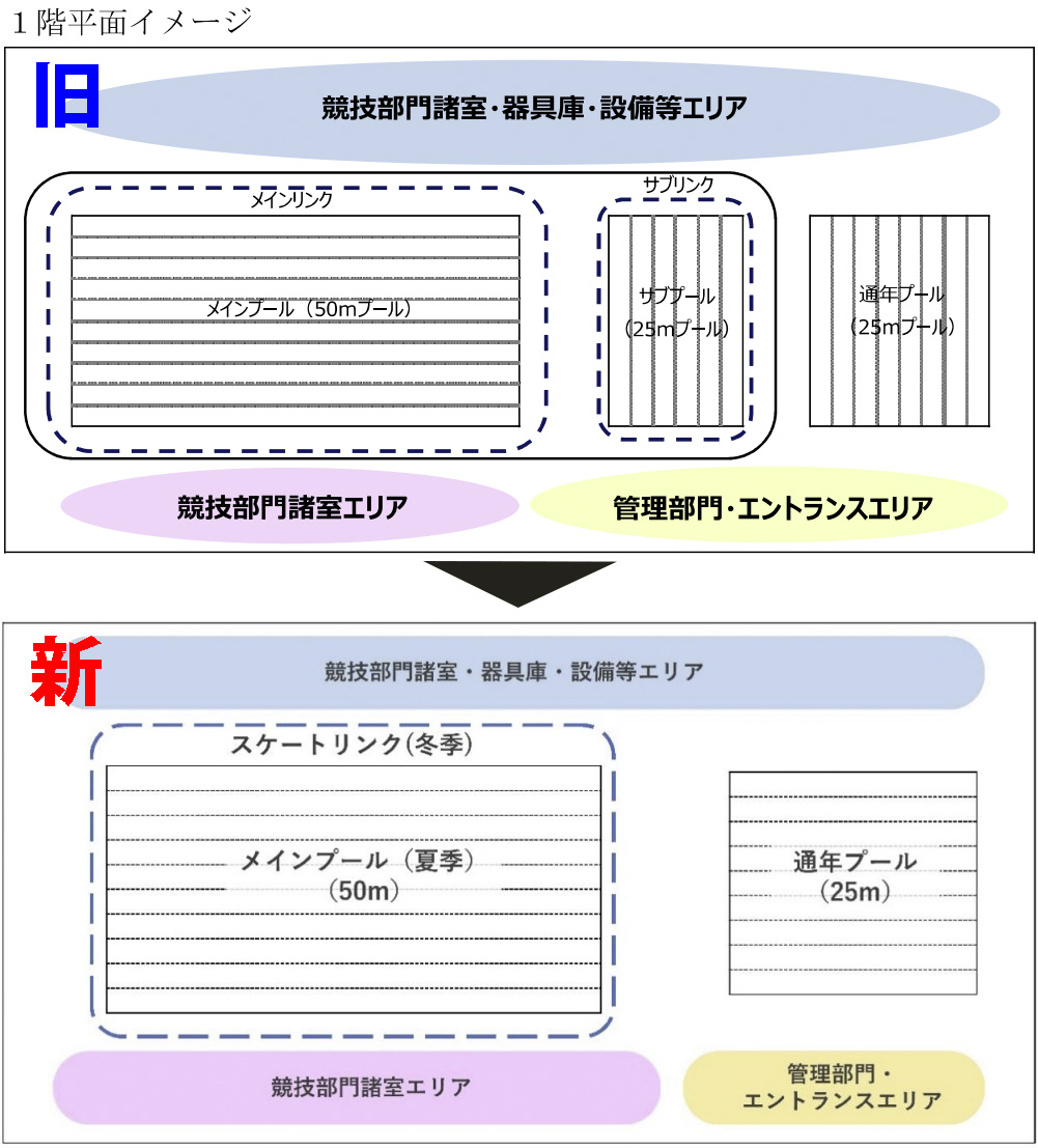 見直しが行われた「基本計画案」では、1階の「サブプール(冬はサブリンク)」がなくなっています。通年プールは、向きが変わり「1レーン」増えて「9レーン」に。
