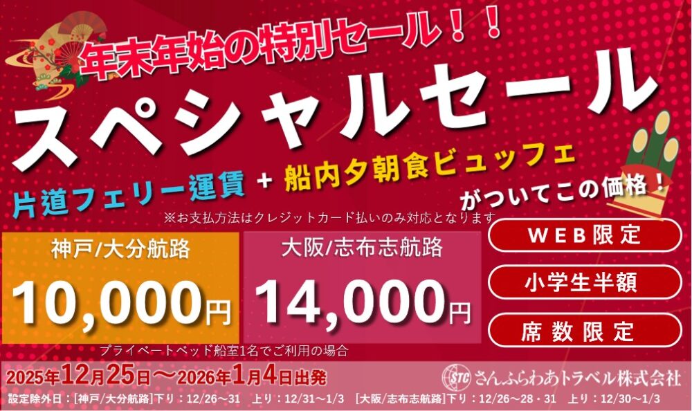 神戸~大分を結ぶフェリー「さんふらわあ」が、年末年始限定の『スペシャルセール』を実施してます。