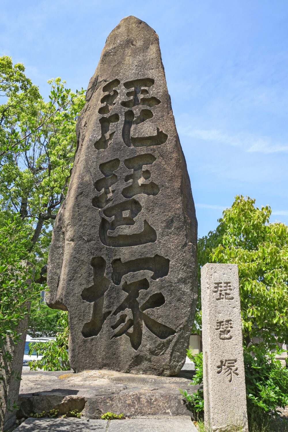 清盛塚のすぐ近くには、清盛の甥で琵琶の名手だった平経正の墓と伝えられる「琵琶塚」も。琵琶の形をした墳墓は珍しく、清盛塚とあわせて見学していく人も多いようです。