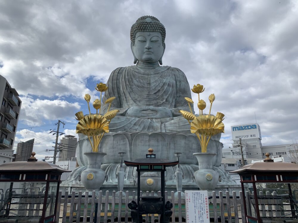 能福寺にある「兵庫大仏」は、奈良・鎌倉とともに「日本三大仏」の一つに数えられてます。1891年に建立された初代の大仏は戦時中の金属回収令で解体されたため、現在の大仏は1991年に再建された2代目なんだそう。