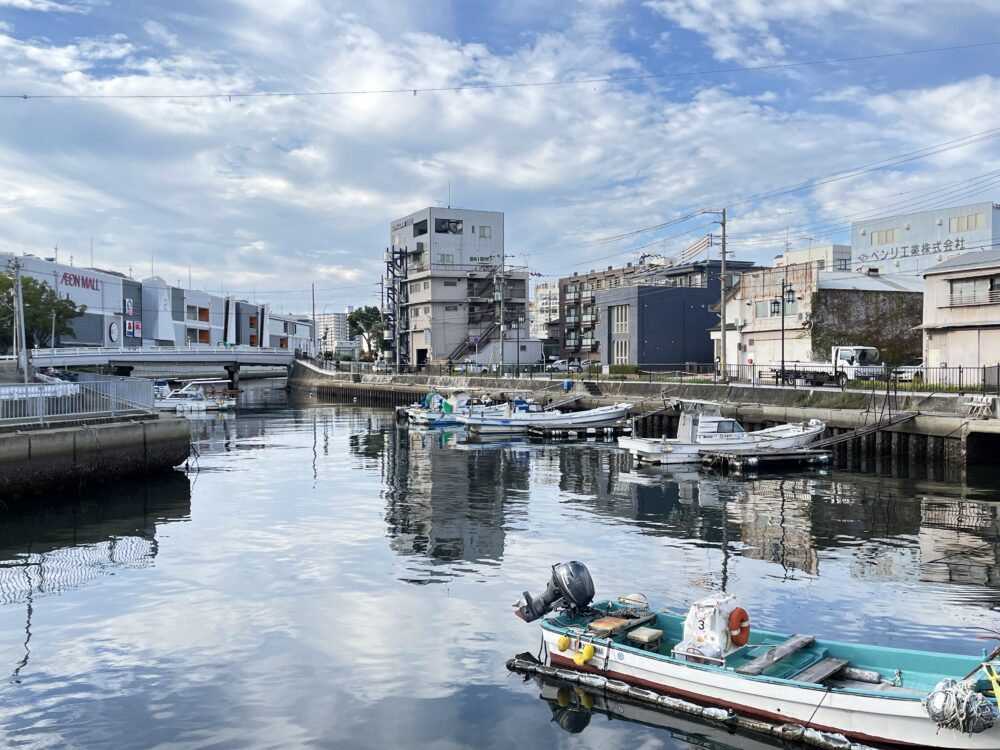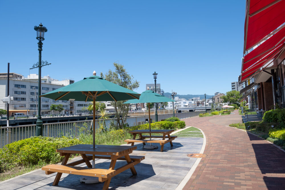 運河沿いには『イオンモール神戸南』があります。ベンチやテント付テーブルの設置されたテラスで、テイクアウトグルメを楽しむのもいいですね。