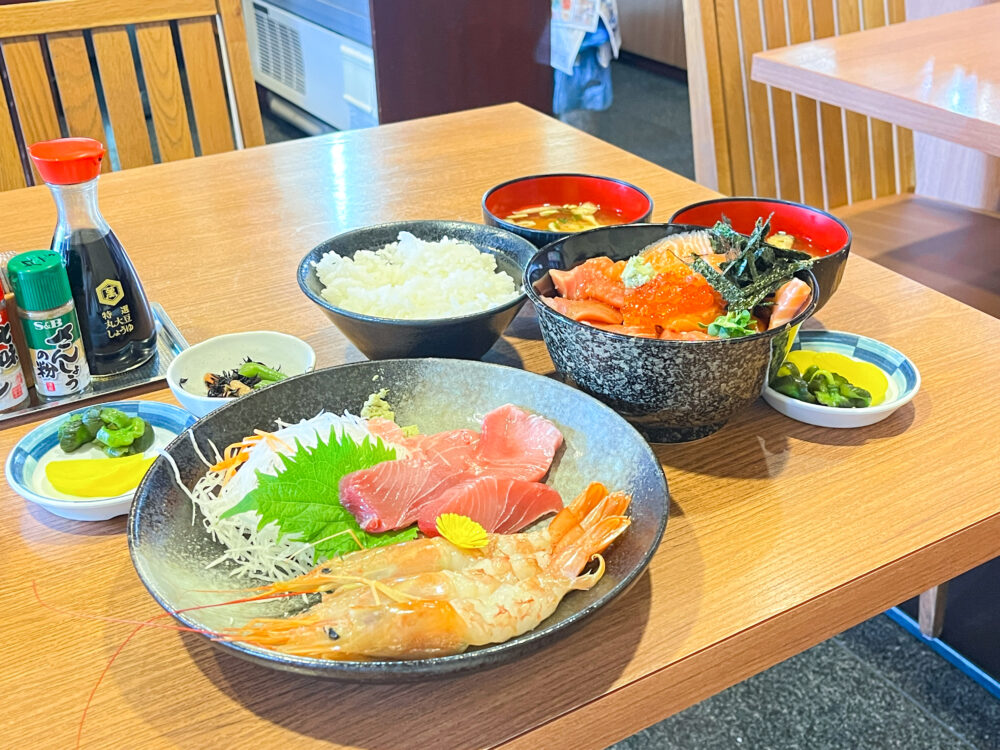 こちらの写真にうつっているのは、海老・まぐろトロ・まぐろキハダが入った「3種盛り合わせ定食」と、3種の海鮮が入った「ぜい沢丼(汁つき)」。どちらも1,500円です。
