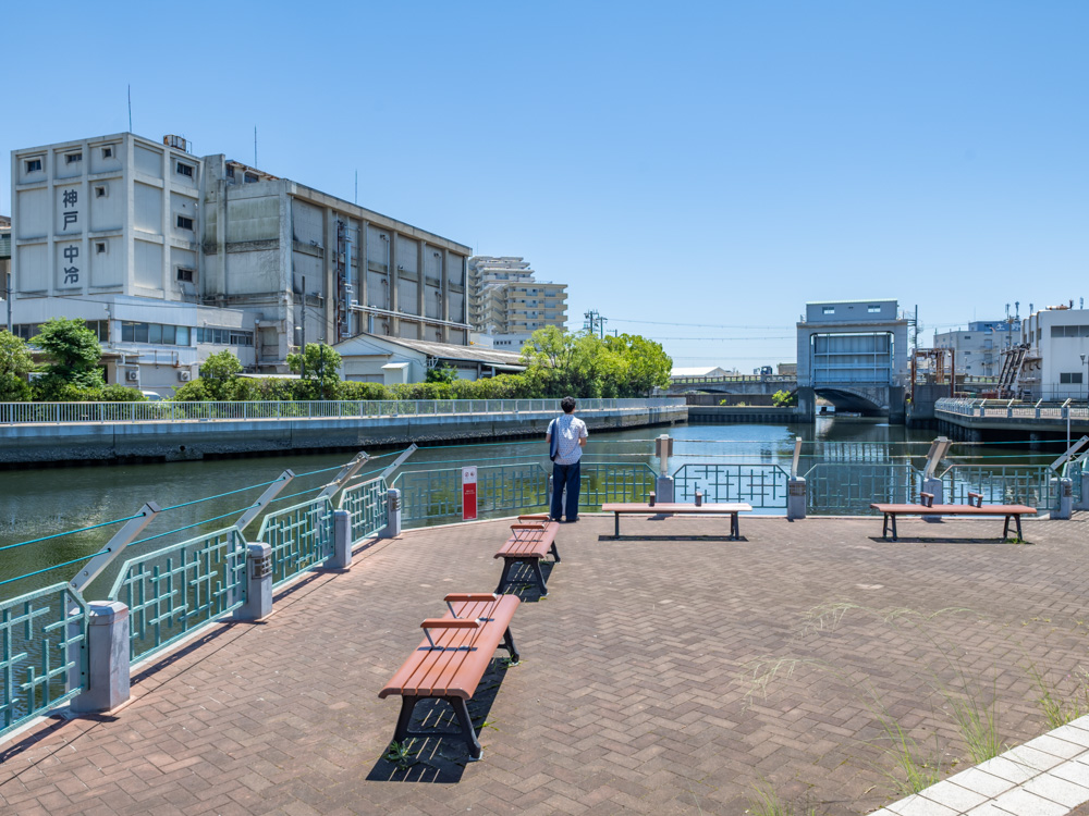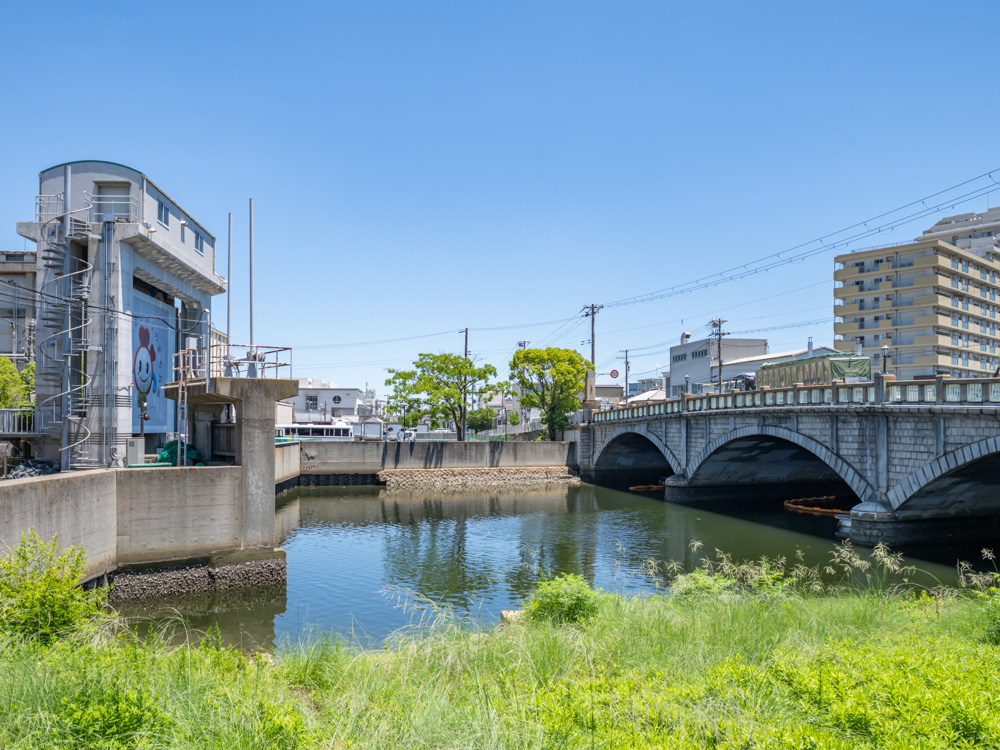 ミュージアムから西へ数分歩くと『大輪田橋(おおわだばし)』が現れます。1924年竣工のコンクリート造りの3連アーチ橋は、今なお現役。