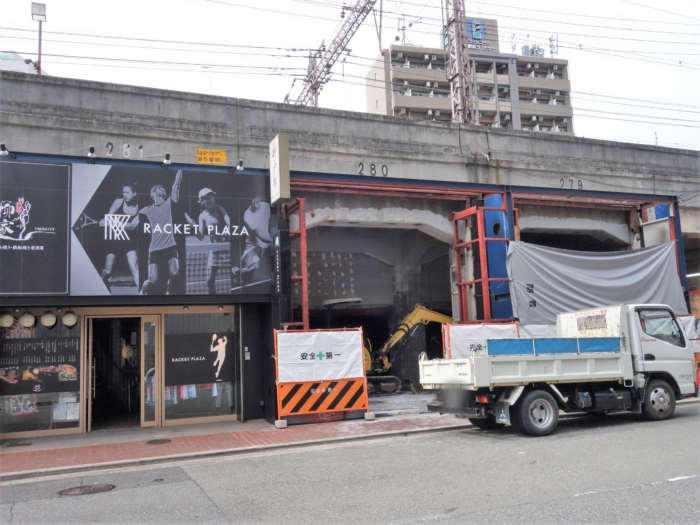移転先となるのはこちら。JR高架下にあるテニス用品店「ラケットプラザ」の隣のテナントで、まだまだ工事中でした。