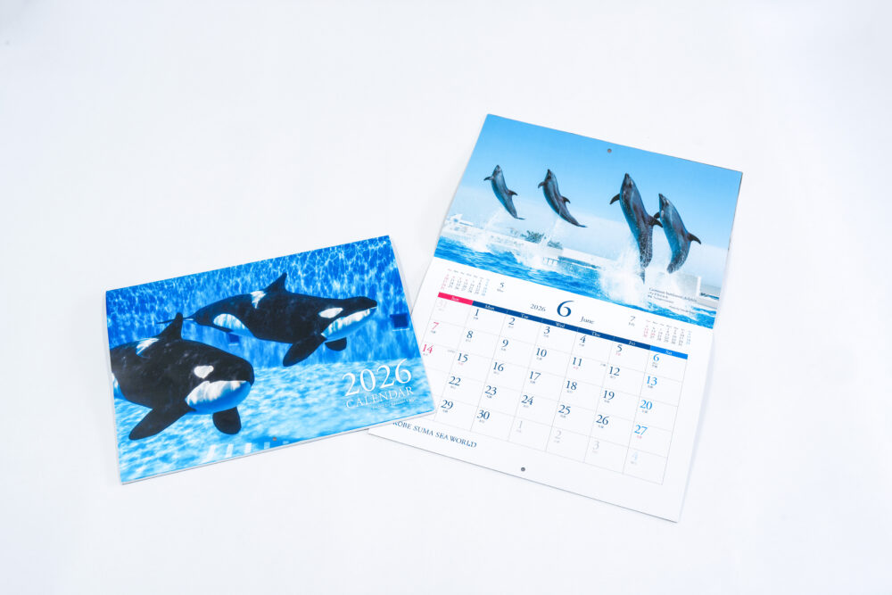 「2026年オリジナルカレンダー」は、優雅に泳ぐシャチの「ステラ」と「ラン」が表紙を飾り、月替わりでスマシーの生きもの達が登場します。