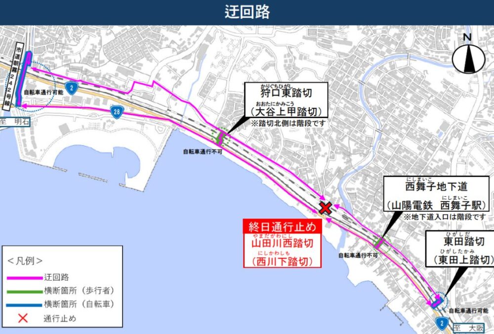 沿線を越える迂回ルートとしては、550mほど西側の「狩口東踏切」か250mほど東側の「西舞子地下道」。どちらも自転車の通行が不可となっているので、自転車で横断する場合はさらに東側にある「東田踏切」まで足を伸ばす必要があります。