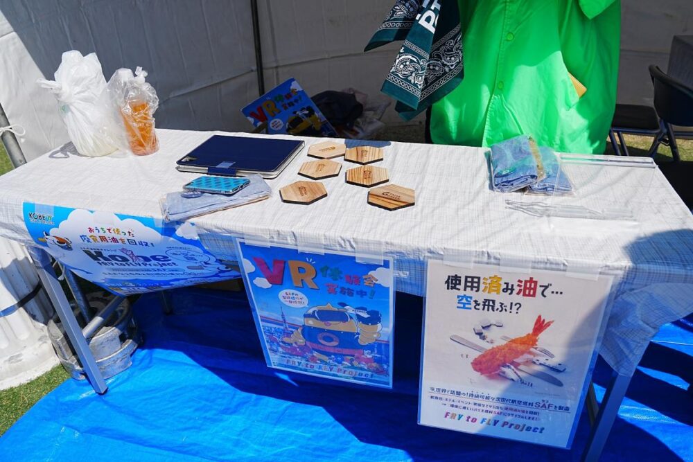 家庭での調理などで出た「植物性廃食用油」をペットボトルに入れて持参すると、ノベルティがもらえます(なくなり次第終了)。特設ブースでは、廃食用油が航空燃料になるまでの製造過程を、VRで体験できるそうです。