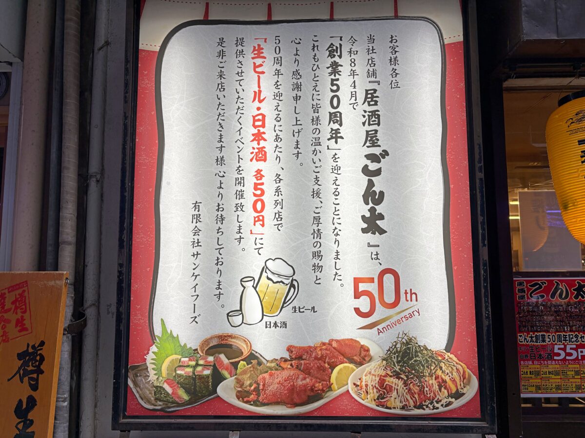 「居酒屋ごん太」が創業50周年を記念したイベントを開催するそうです。
