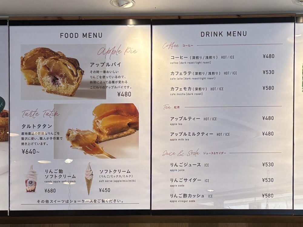 品種別りんごスイーツやスペシャルティコーヒー、5種類のりんごのドリンクなどがずらり。アップルパイなどはりんごの品種を変えながら年間を通して提供されているようです。