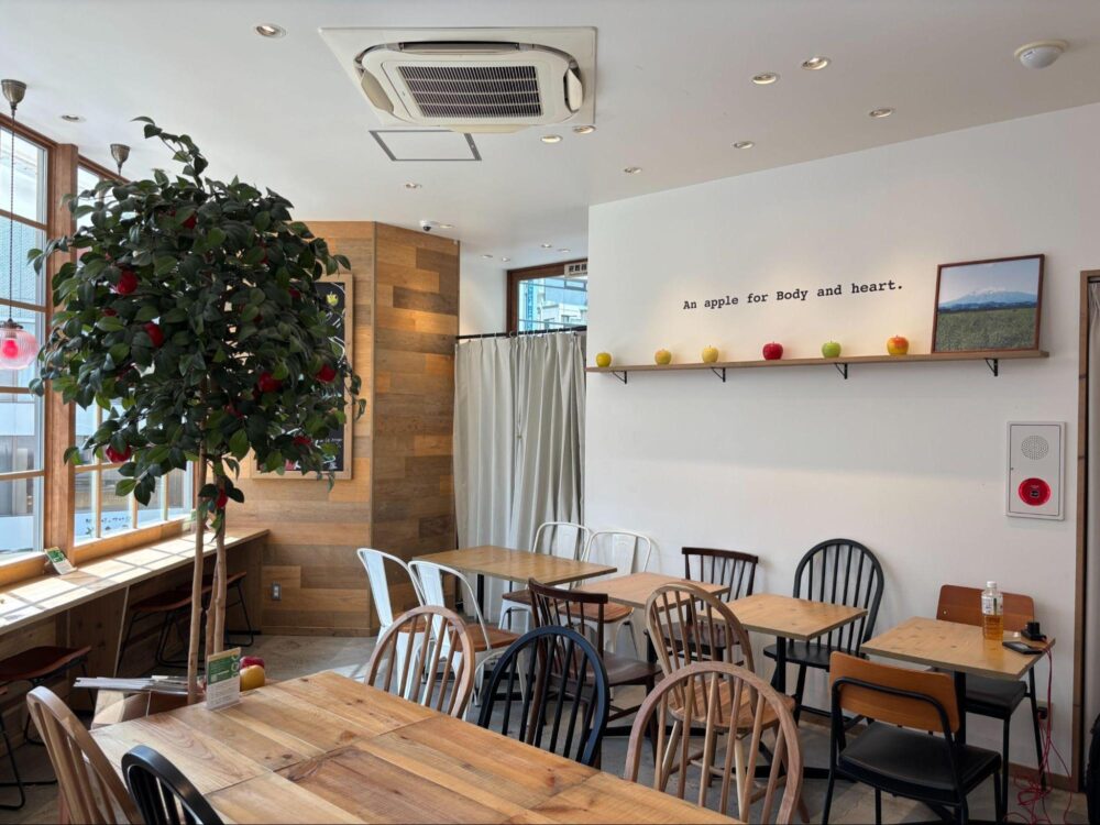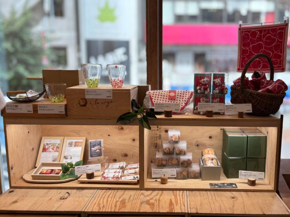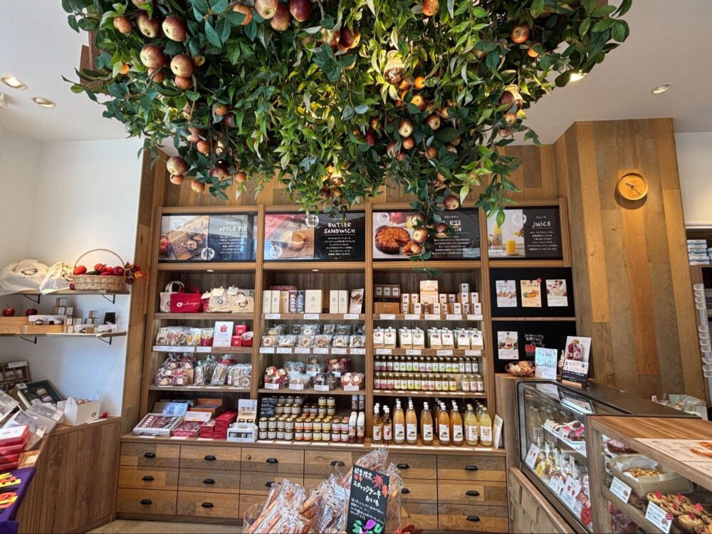 1階はショップになっており、木のぬくもりが感じられる落ち着いた空間。スイーツやドリンク・りんごジャム・雑貨など、りんごの魅力を楽しめる商品が並んでいます。