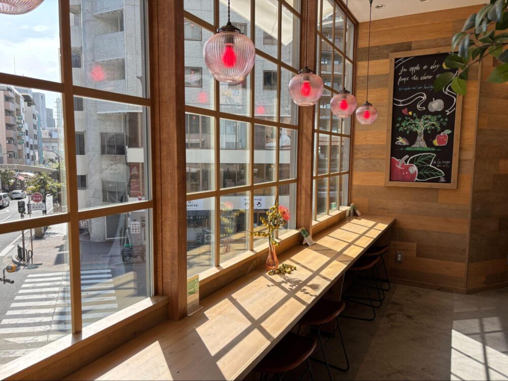 せっかくなので神戸の町を眺めながらゆったりできる陽当たりのよいカウンター席へ。りんごをモチーフにしたランプが可愛らしいですね。