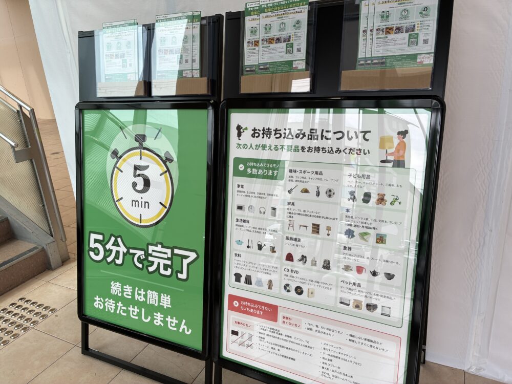 譲り受け希望者は、持ち込まれたモノの情報を地域の情報サイト「ジモティー」で検索し、ジモティースポットで引き取ることでマッチングが成立する仕組みになってます。
