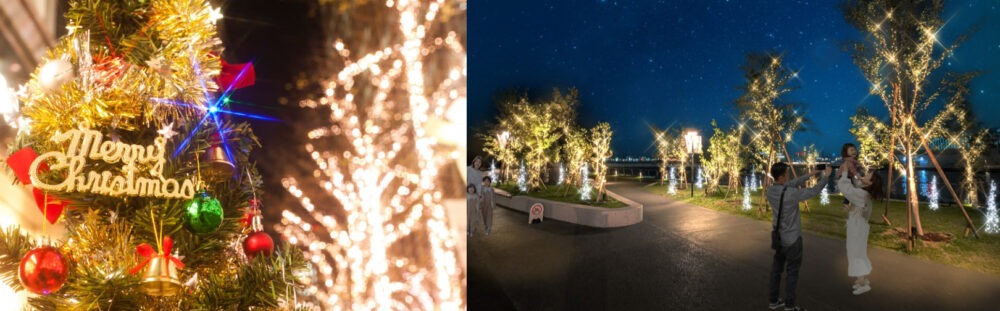 270度海に囲まれたTOTTEIには、ジーライオンアリーナ神戸前に「クリスマスツリー」が登場。TOTTEI PARKまでのルートもイルミネーションで照らされています。