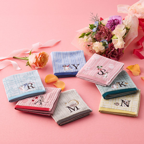 イニシャルミニタオルは、綿100%のふんわりとした肌当たりの生地を使用。イニシャルは、M、Y、A、S、N、R、Kの計7種類から1枚選ぶことができます。アルファベットの一つひとつに、動物たちの小さなストーリーが添えられているんだとか。
