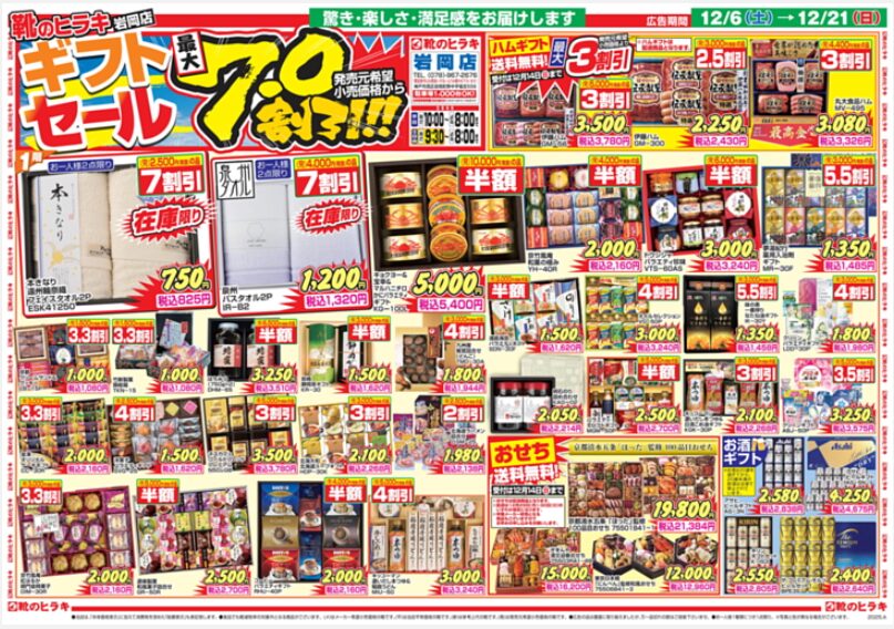 ハム・洋菓子・ビールなどの「食品ギフト」が3割引~半額になっているほか、「タオル」のギフトセットは「7割引」になっているんだそう。在庫限りです。