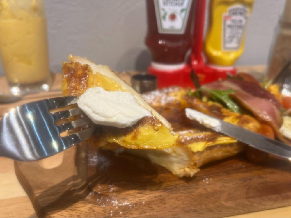 フレンチトーストはメープルシロップをたっぷりかけていただきます。分厚くもちふわな食感なのでかなりボリューミー。