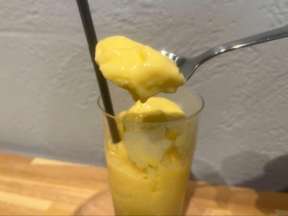 ドリンクは「ローズンミックスジュース(700円 ※セットの場合は-100円)」を注文。シャリシャリとしたシャーベットのような食感で、どこか懐かしいミックスジュースの味が口の中でキーンと広がります。