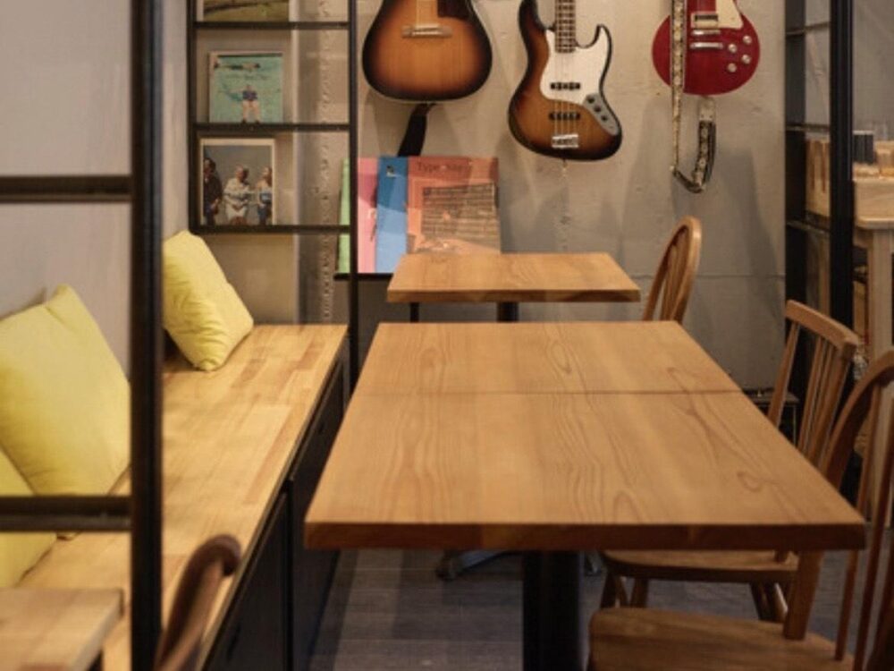 店内はギターやカラフルな雑貨、木で統一された家具が並んでいておしゃれで落ち着いた雰囲気です。