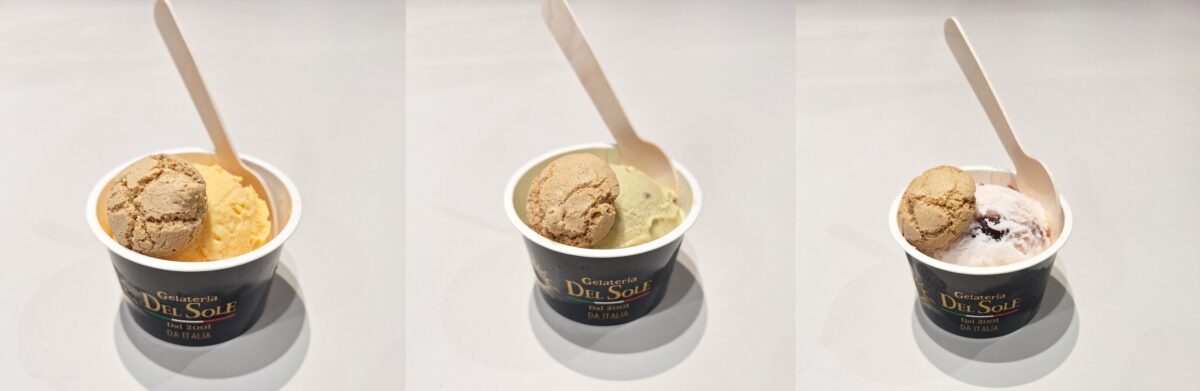 万博イタリアパビリオン人気ジェラートカップ盛り3種、イタリア伝統菓子アマレッティ付き