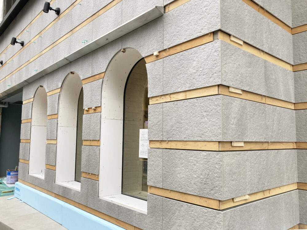 グレーの外壁に均一な間隔で横ラインが引かれ、以前は一面ガラスだった南面と東面にアーチ窓のようなデザインが施されてます。