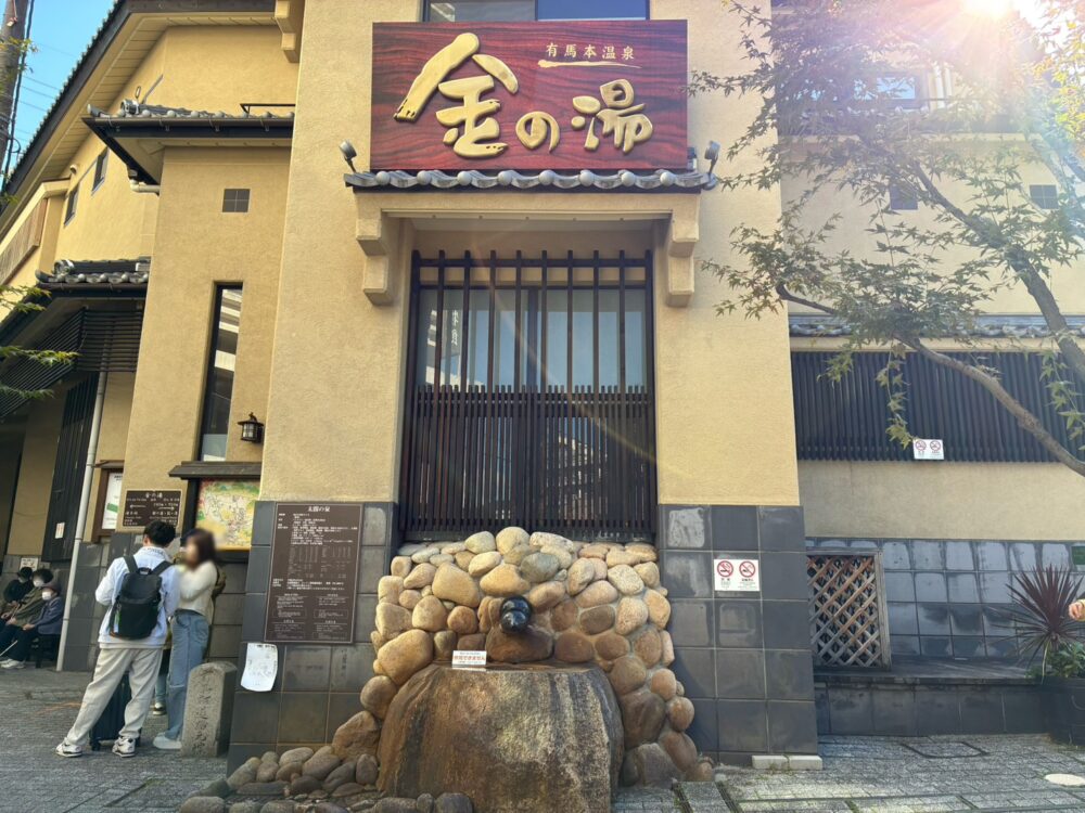 湯泉神社から有馬温泉駅への道の途中には、「金の湯」があります。「金泉」が特徴の外湯で、日帰りで有馬の温泉を楽しむなら外せない温泉です。