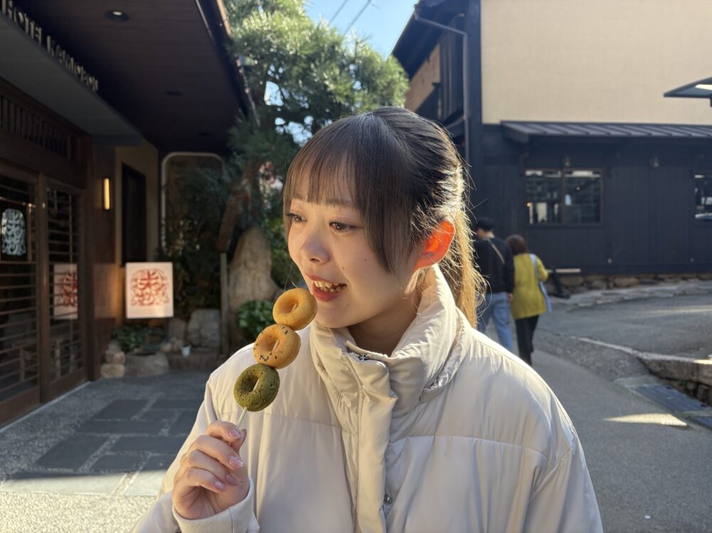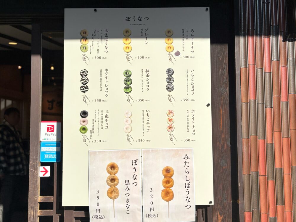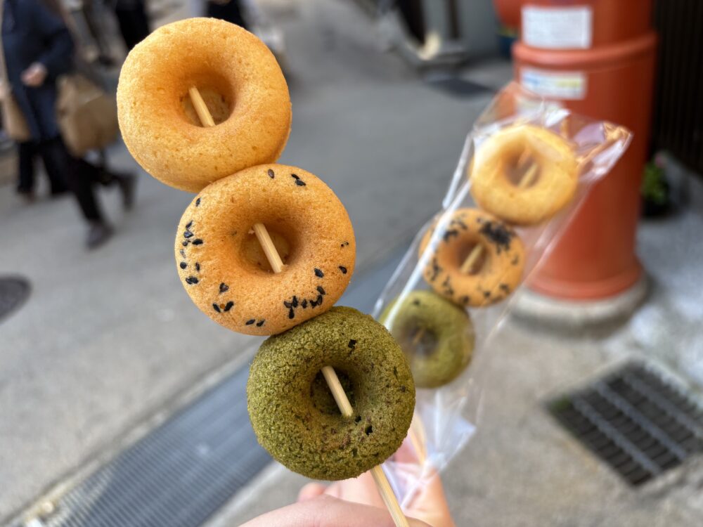 豆乳ドーナツを串に刺した「ぼうなつ」は、食べ歩きにぴったりの一品です。