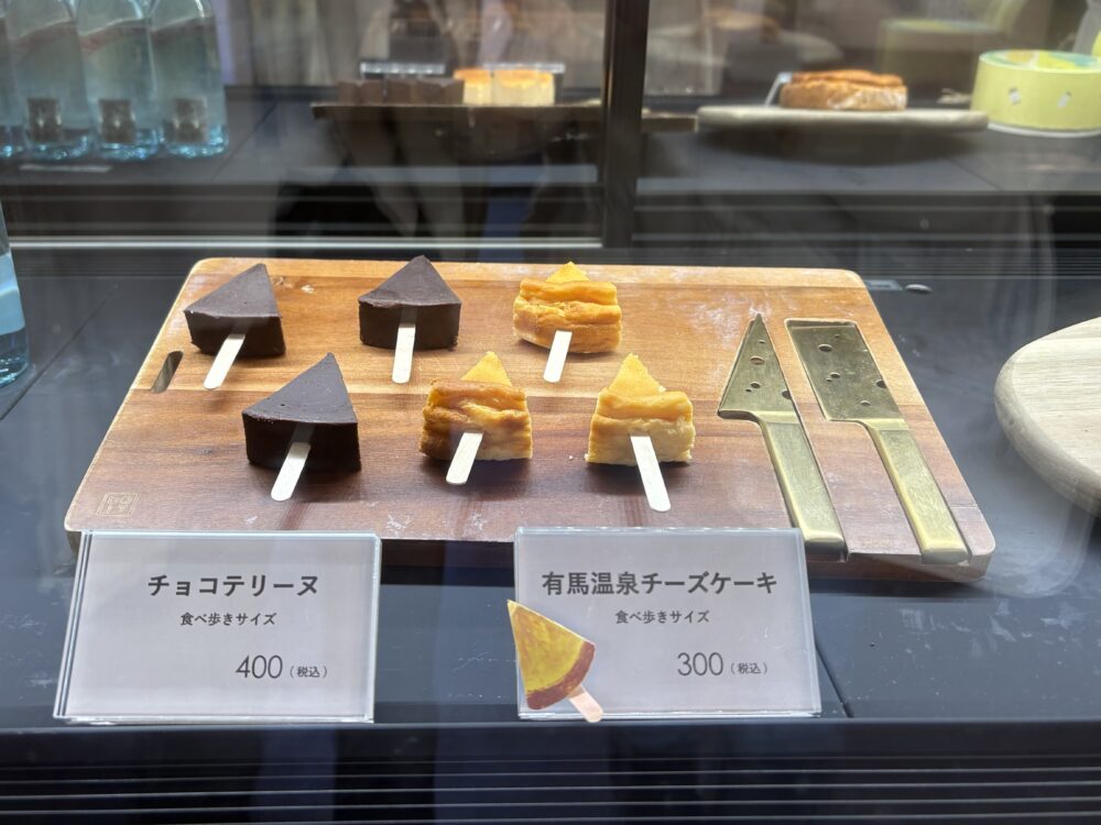 今回は、一口サイズにカットされ、棒にささった「チョコテリーヌ」(400円)と「有馬温泉チーズケーキ」(300円)をチョイス。手のひらにちょこんとのるサイズ感で、見た目もキュート!