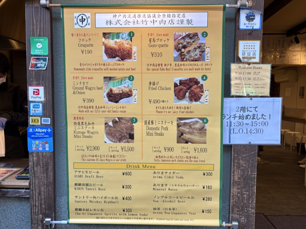 有馬温泉駅から徒歩6分ほど歩き、湯本坂を上る途中に「竹中肉店」があります。大正初期の創業から約100年、有馬温泉の地で愛されてきた老舗で、国産黒毛和牛や、神戸牛を厳選して取り扱っています。