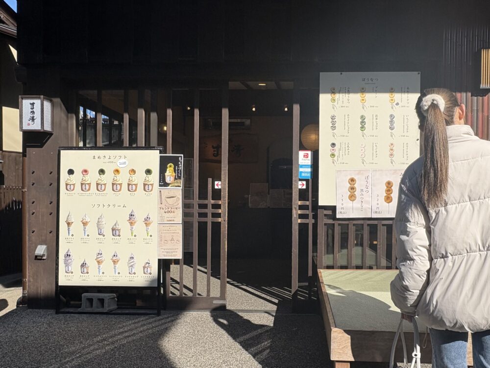 竹中肉店のすぐ向かいにある「まめ清」へ。豆腐屋が手がけるお店ならではの豆乳を使ったソフトクリームやドーナツなど、体に優しいスイーツが楽しめます。