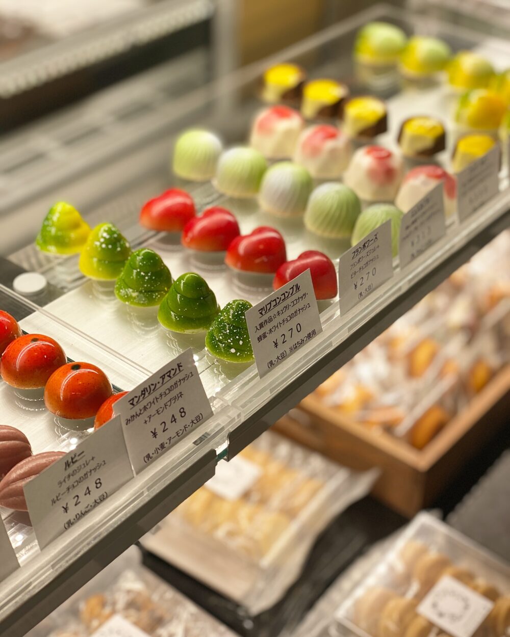 色とりどりのボンボンショコラは、一粒から購入OK。チョコレート以外に、ケーキや焼き菓子、ソフトクリーム、ホットチョコレートのようなドリンクも提供してます。