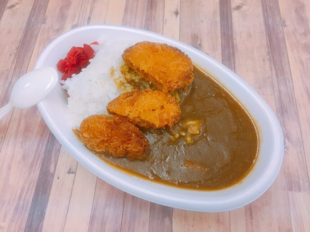 メニューは「ビーフカレー(800円)」「ヒレカツカレー(950円)」「エビカツカレー(950円)」の3種類。数種類の野菜をじっくり煮込んだというルーはビリ辛で、屋台のような容器も競馬場ならではといった感じです。