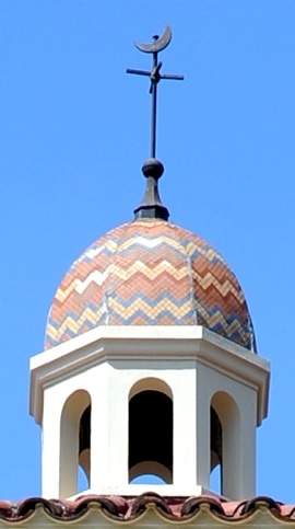 なかでも注目したいのが、シンボル的存在となっている「時計台」です。上部にはモザイクタイルの小ドームを据え、頂きには学院のシンボルマークである「新月」を冠したクロスが。