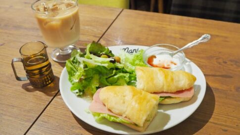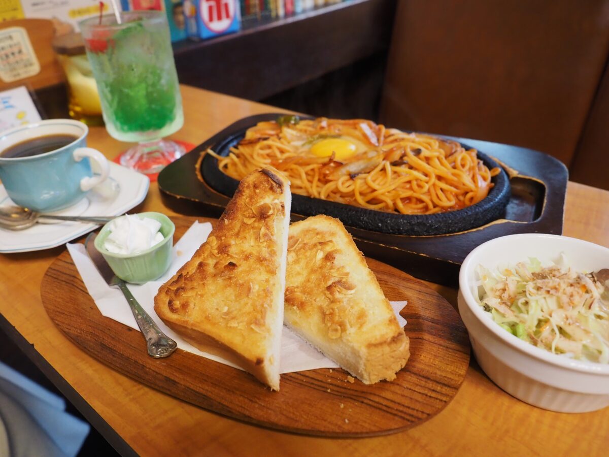 今回注文したのは自家製アーモンドトーストの「Fセット(800円)」。軽食メニューの「鉄板ナポリタン ドリンクセット(1,380円)」もあわせて注文しました。ナポリタンにはミニサラダ付き。