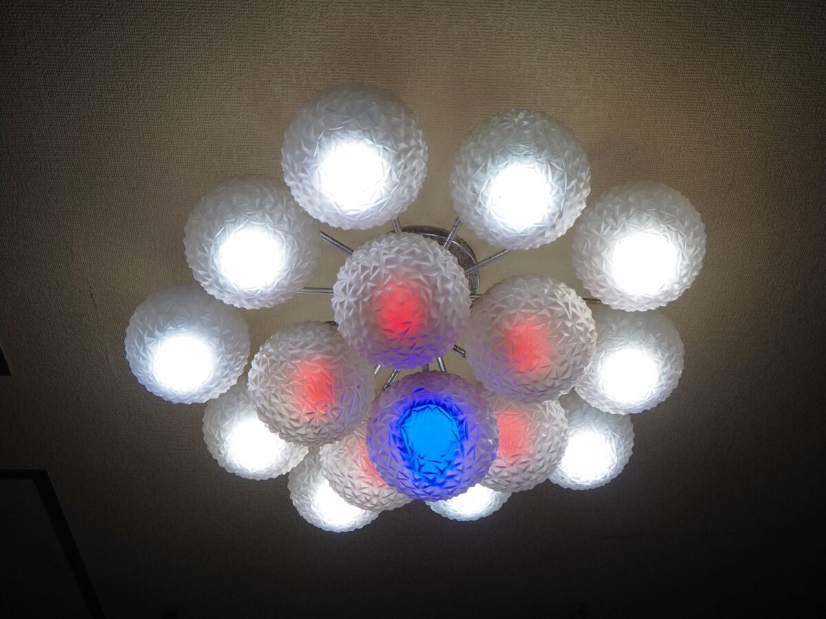 天井にはレトロポップな照明が。こちらは、2018年に閉業した「喫茶ローズ」で、50年以上使用されていた照明なんだとか。時を経て「喫茶ポエム元町本店」にやってきたそうです。