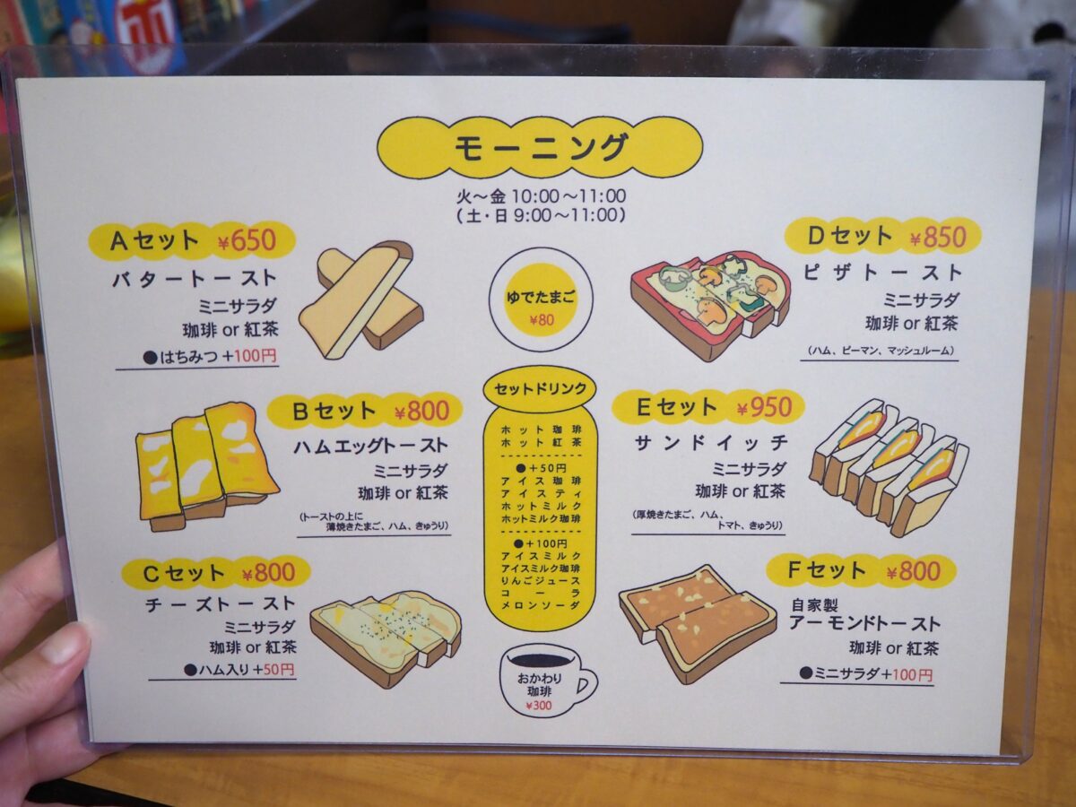 メニューは全部で7種類。いろんなトーストがメインのA~Fセットのほかに、目玉焼きとバタートーストが味わえる「目玉焼きのモーニング(800円)」があります。