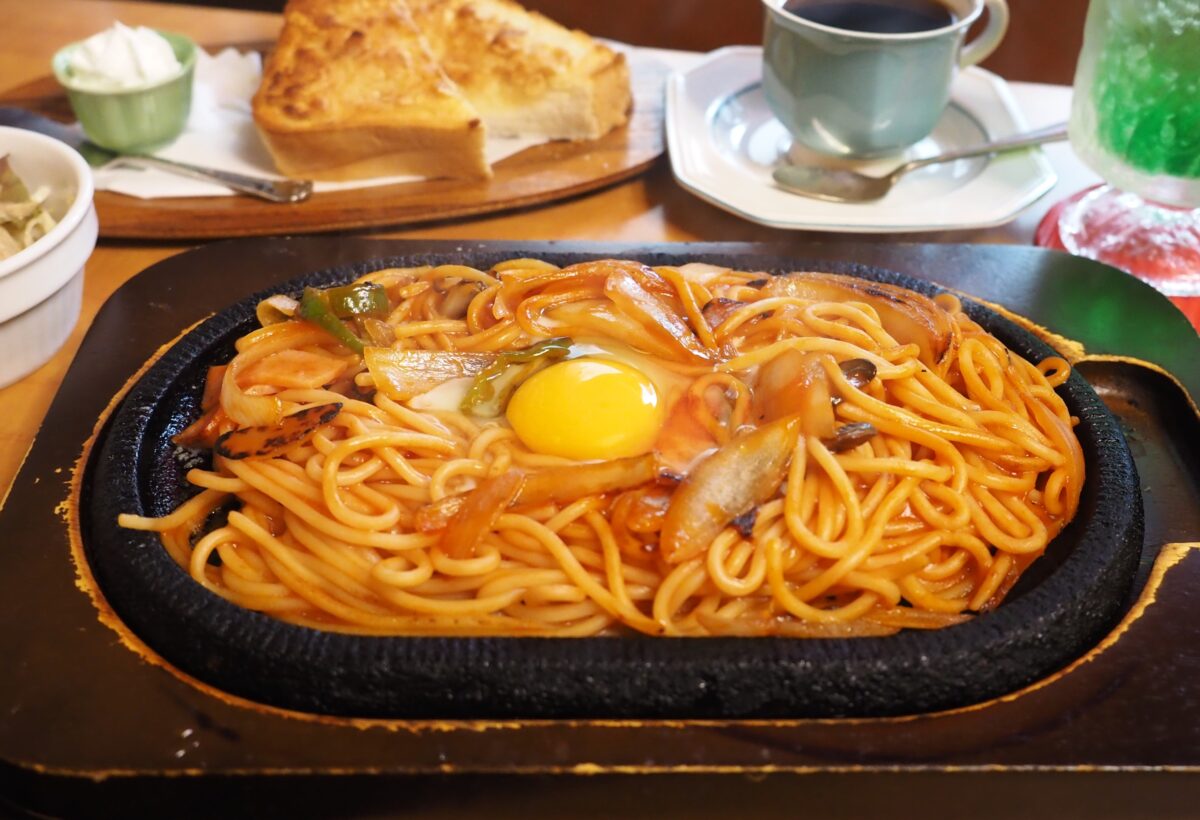 「ナポリタン」はあつあつの鉄板で出てきます。じゅうじゅうと湯気が立ち上る中、熱いうちに生卵のトッピングを混ぜていただきます。具材はハム・マッシュルーム・玉ねぎ・ピーマンとシンプルですが、もちもちした太麺で食べ応え十分。粉チーズやタバスコで、味の変化も楽しめます。