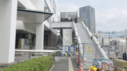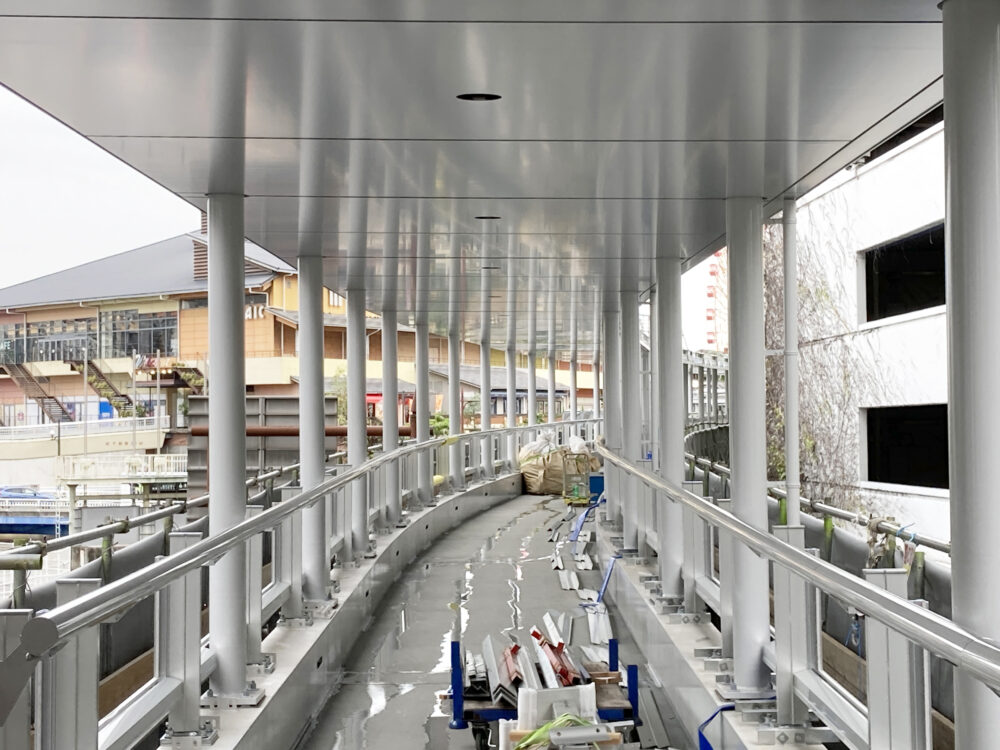 『弁天町交差点デッキ』を「umie」の前まで延長する工事で、シートが外され屋根部分がお目見えしてます。