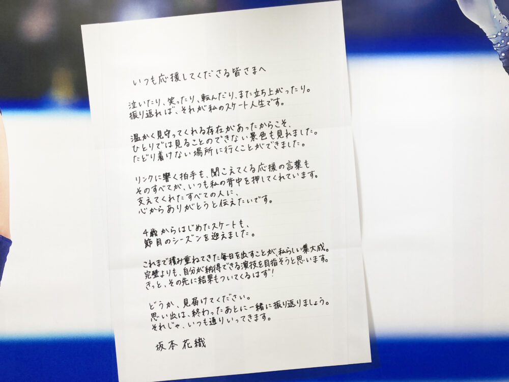 今季で引退を表明しているフィギュアスケートの坂本花織選手の「直筆の手紙」が、オリンピック挑戦を前に地元神戸に飾られてます。