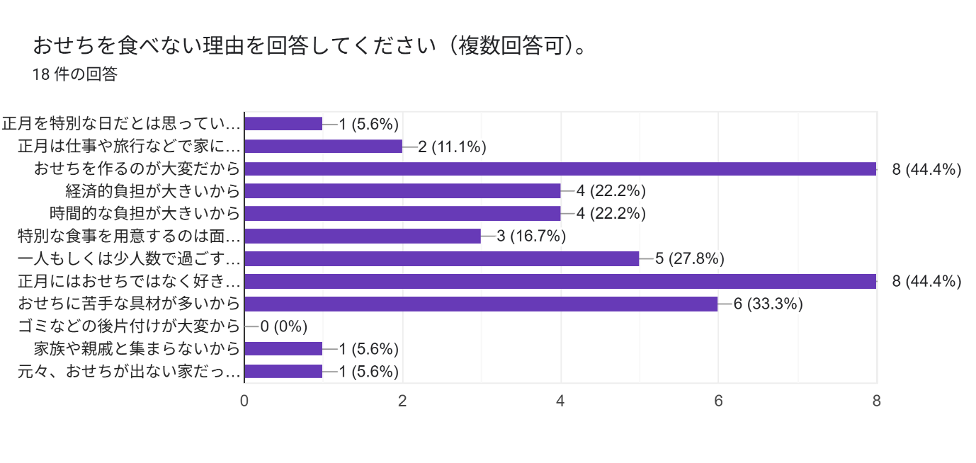 その結果「好きな料理が入っていない」「おいしいと思わない」「作るのが面倒」「値段が高い」といった意見が多く見られ、さまざまな面でおせち離れが進んでいることを知ります。
