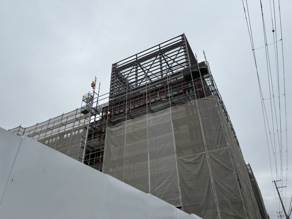 3フロア分の土台は完成しつつある模様。1番上のフロアには一部高くなった部分ができていて、看板などが設置されるんでしょうか。
