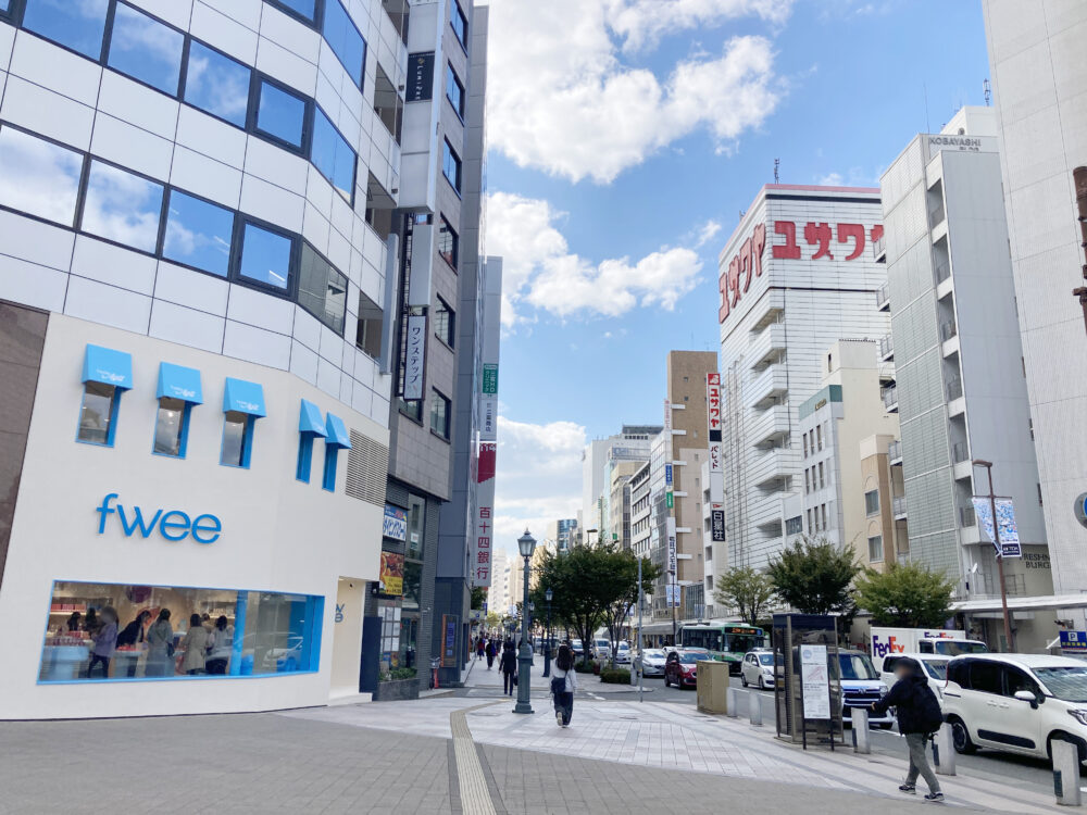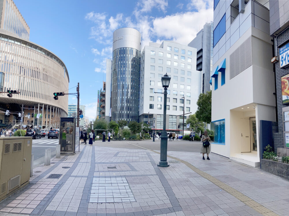 お店の東側を向くとこんな感じで、三宮中央通り沿いには「ユザワヤ 神戸店」や「播州信用金庫 神戸本部」などがあるあたりです。