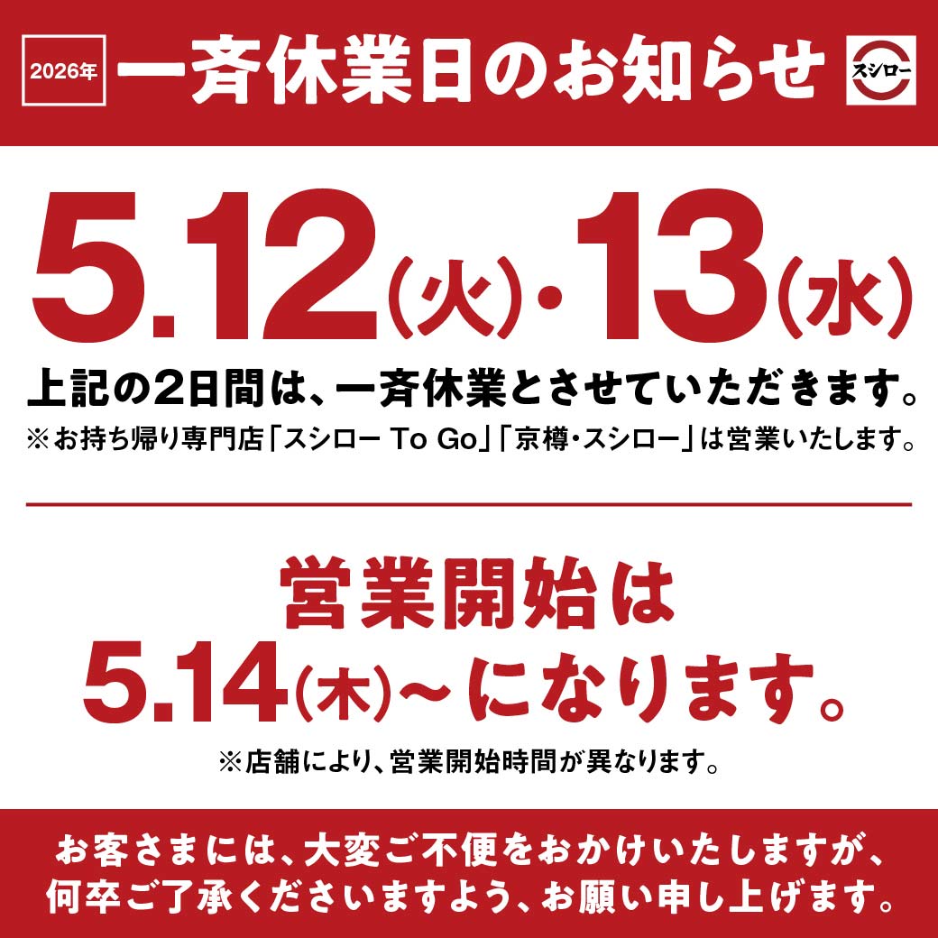 お持ち帰り専門店「スシロー To Go」「京樽・スシロー」は営業されますが、その他店舗はすべて5月12日(火)・13日(水)の2日間「休み」となります。