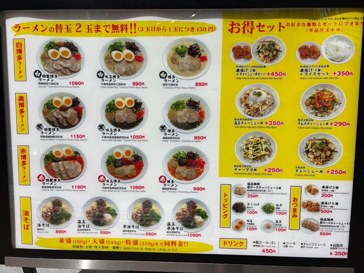 並盛の2倍になる「特盛」までが同じ料金で、さらに替え玉は2玉まで無料なのだとか。