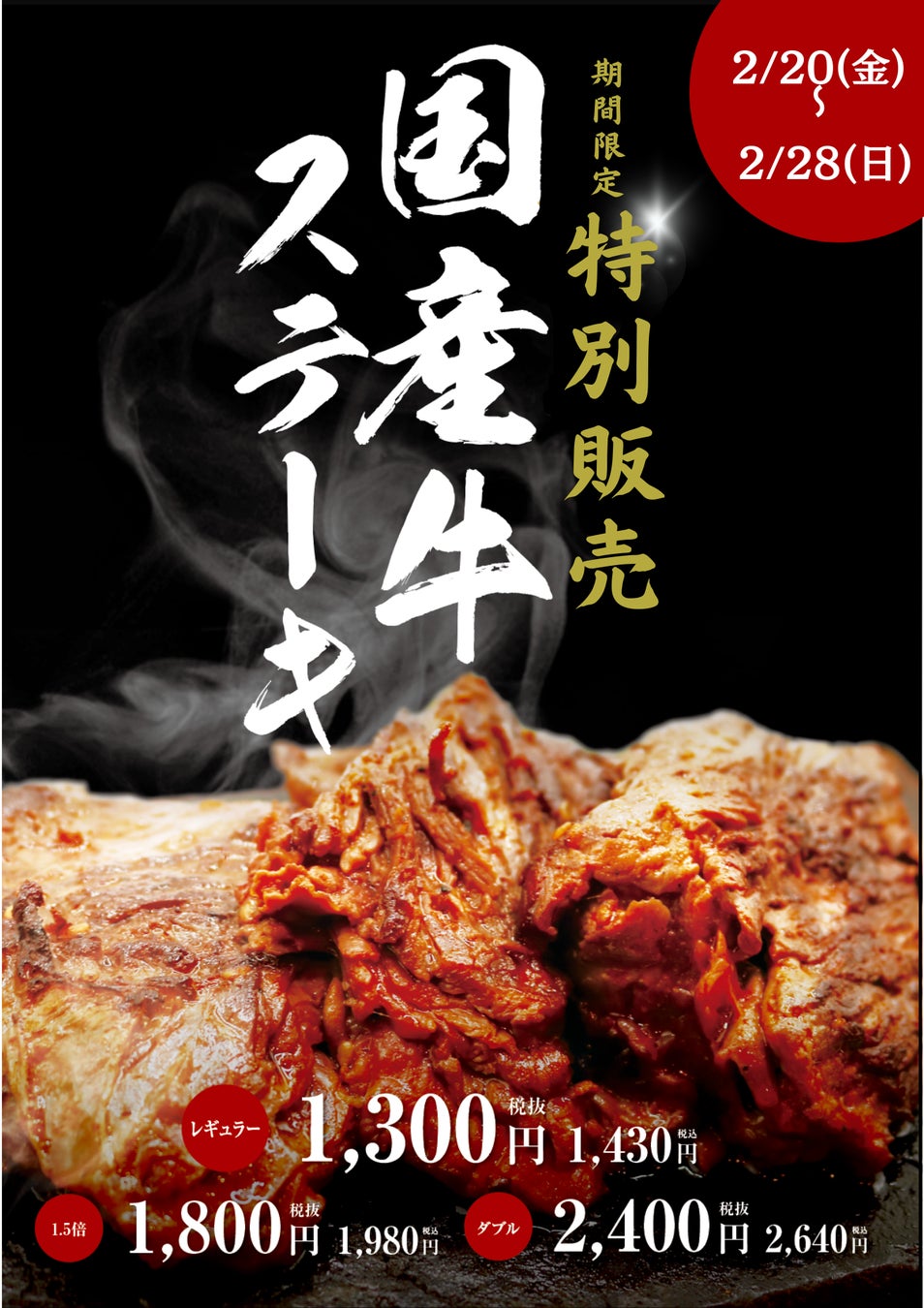 新店舗のオープンを記念して、「肉のエサカ神戸元町店」で、『国産牛ステーキ』が平日でも楽しめます。今月より土日限定で提供されているメニューです。