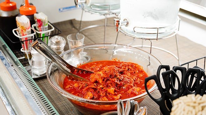 ご飯の大盛りや特盛は「無料」で、希望すれば「フォカッチャ」に変えることもできます。名物の「キムチ食べ放題」は、辛さが控えめで旨味がたっぷりだそうですよ。