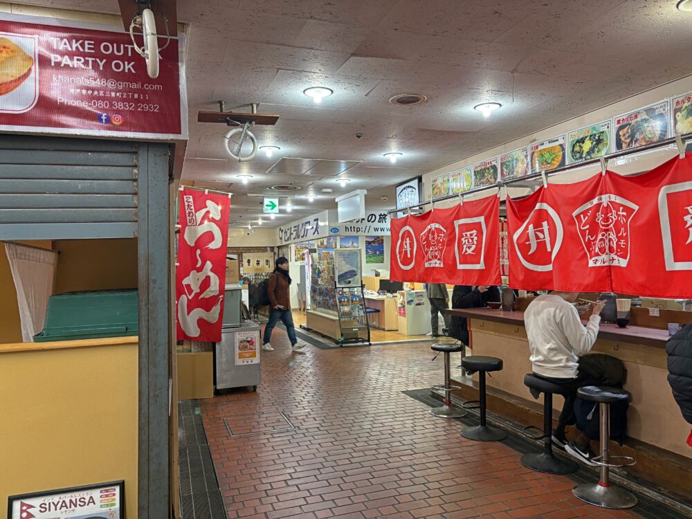 反対側を向くと、このような感じ。向かい側には「どんぶりマルナカ」というお店があります。南側にあるのは「幸福源」という中華料理屋さん。