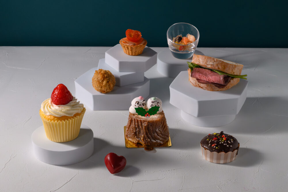 セイボリーもクリスマスらしい味わいに。「トアロードデリカテッセン」の柔らかくジューシーなローストビーフを「コム・シノワ」のブリエでサンドしたボリューム満点の「サンドウィッチ」などが並びます。