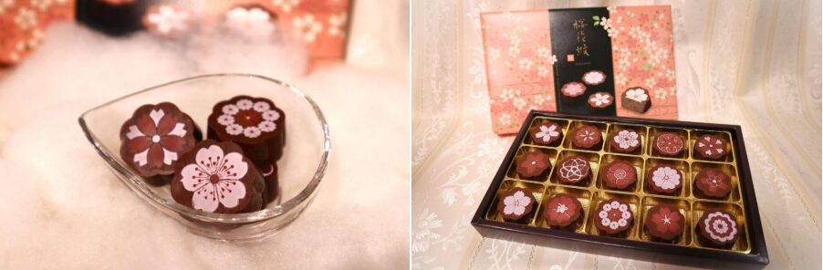 ミルクチョコレートの中に、ヘーゼルナッツペースト入りのチョコレート(ジャンドゥヤ)が入った、ナッツの香ばしい風味のチョコレート。15種類の桜の花紋が、満開桜のように、華麗に並びます。