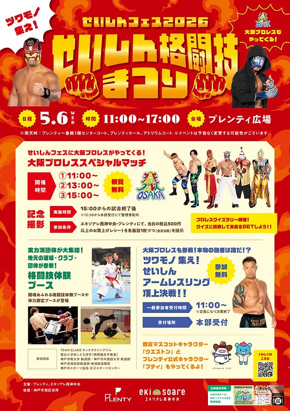 地下鉄 西神中央駅のすぐ近くにある「プレンティ広場」で、大阪プロレスも登場する『格闘技』のイベントが開催されます。観戦無料です。