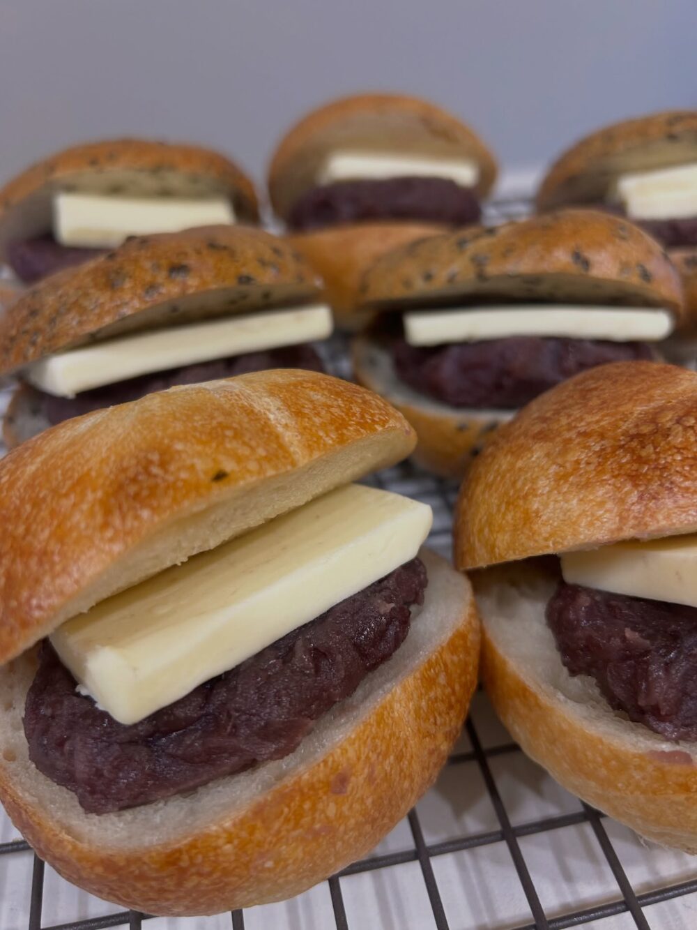 メニューは定期的に変えているようで、2月下旬の週は、プレーン、チョコオレンジ、ゴマベーコンチーズ、おさつバター、大納言甘納豆クリームチーズが並ぶ予定。